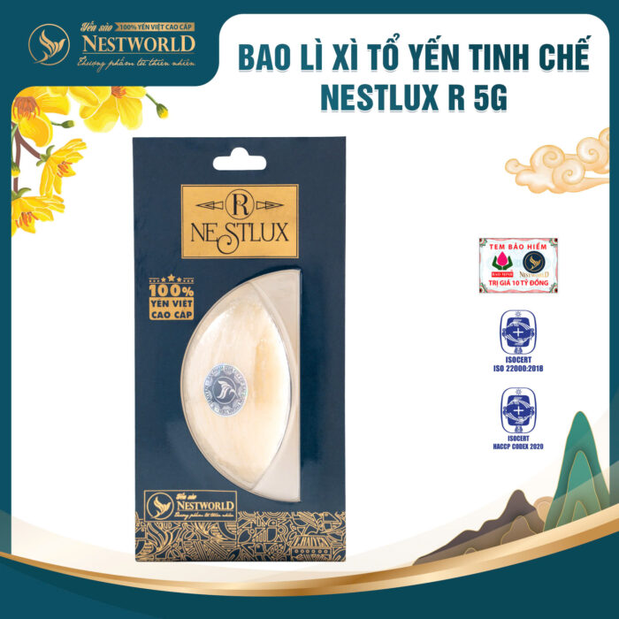 Mỗi bao lì xì là 5g Tổ yến tinh chế đã được làm sạch và định hình đẹp mắt. Cam kết yến sào nguyên chất được khai thác từ hệ thống nhà yến của Yến sào Nestworld, không chất độn, không tẩy trắng yến, không chất bảo quản, không dùng chất phụ gia.