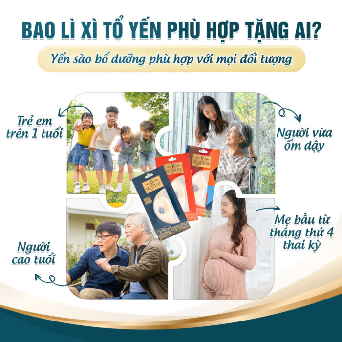 - Người cao tuổi: yến sào hỗ trợ duy trì sức khỏe tổng thể, hỗ trợ tăng cường miễn dịch; hỗ trợ cải thiện các chức năng quan trọng như trí nhớ, tim mạch, tiêu hóa và xương khớp.