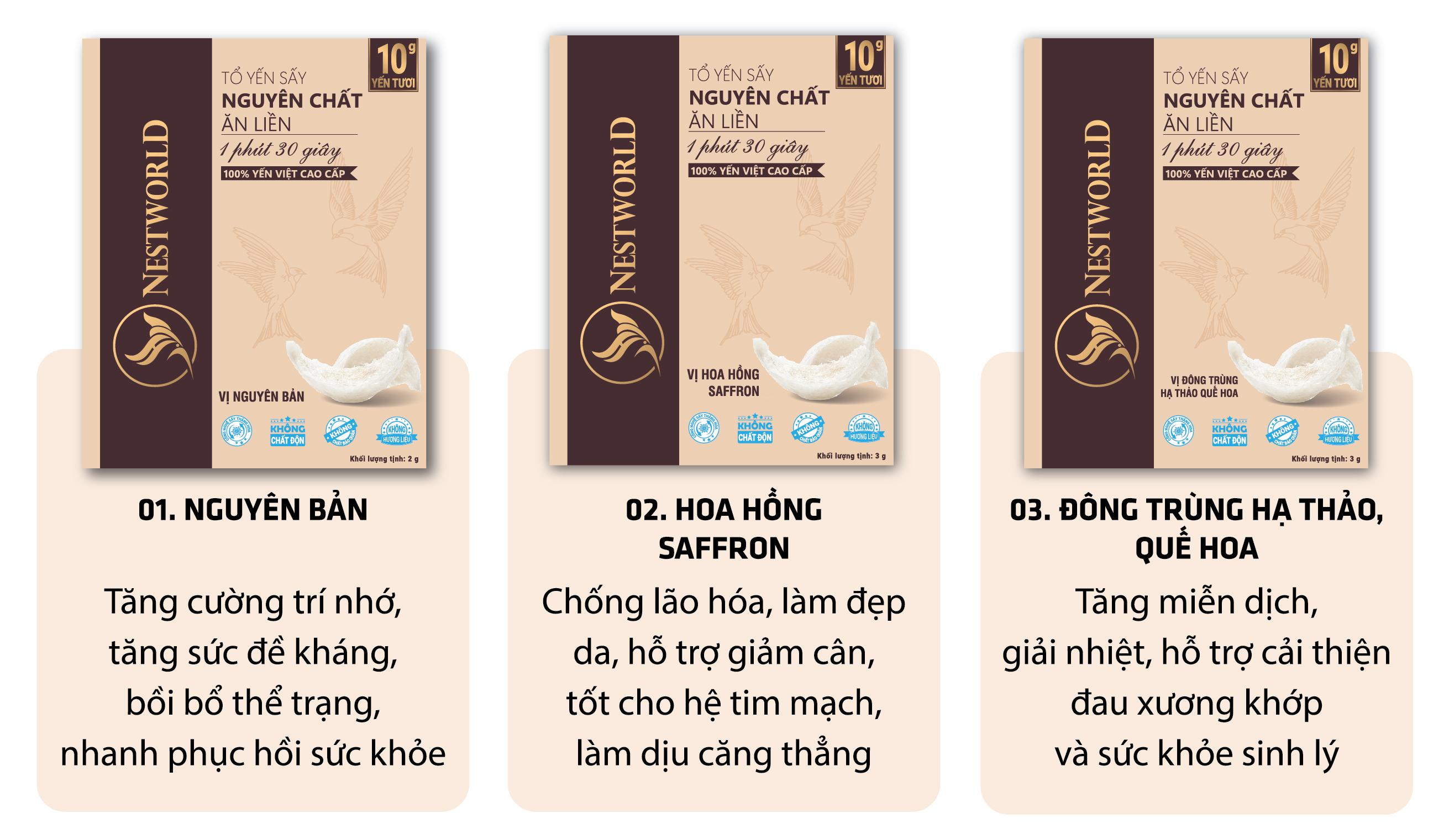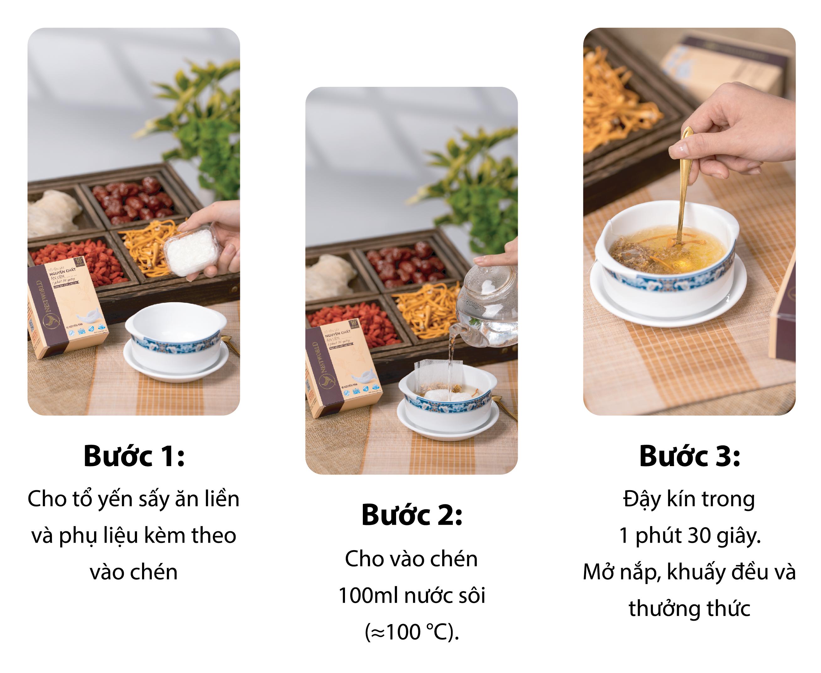 Không cần phải tất bật sơ chế và chưng nấu kỳ công như trước, với Tổ Yến Sấy Nguyên Chất Ăn Liền Nestworld, bạn chỉ cần rót nước sôi vào thanh yến kèm phụ liệu là đã có ngay chén yến chưng bổ dưỡng.